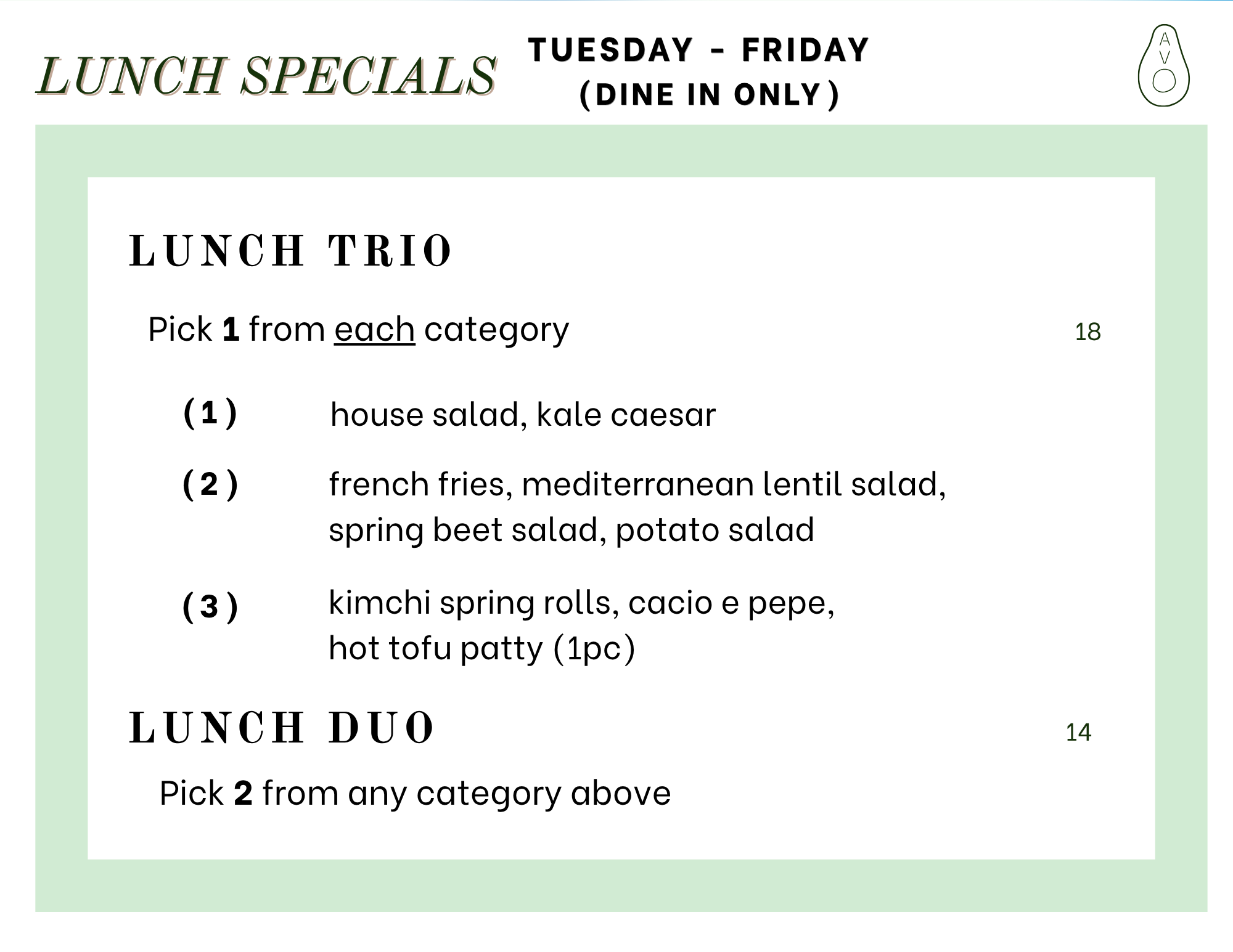 We just updated our menu and thereβs new lunch specials available Tuesday-Friday for dine-in only. Check out our menu here.